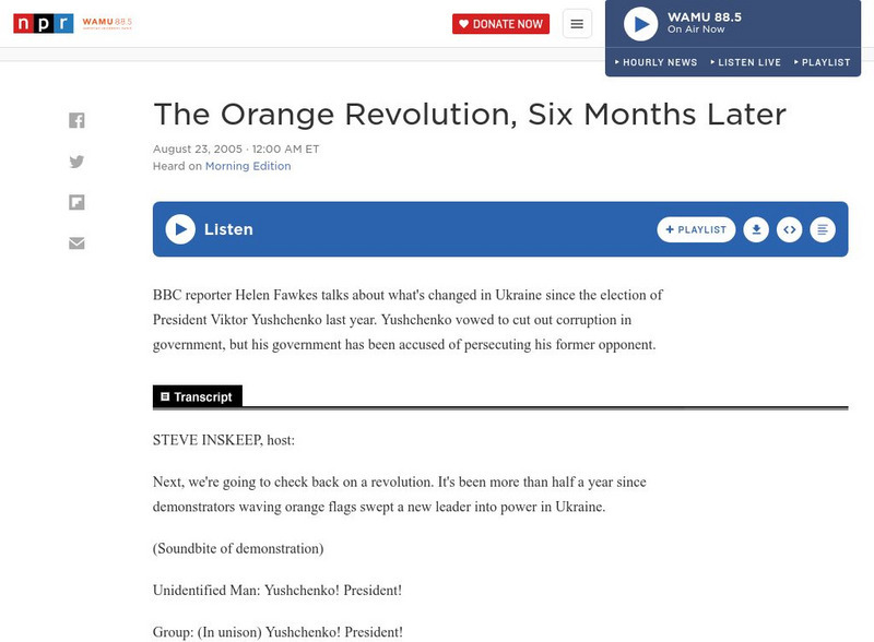 An April 2005 audio interview with Helen Fawkes, the BBC reporter who covered the Orange Revolution, and the consequences of that event six months later.