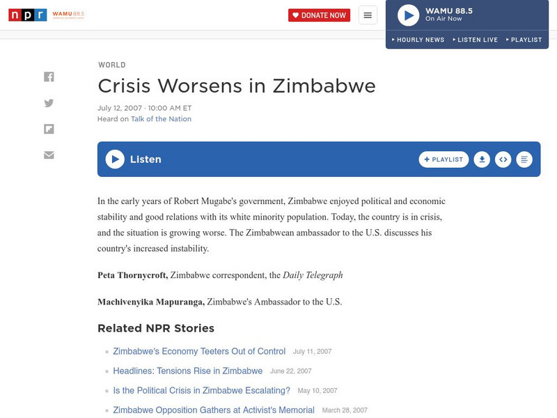 A 30 minute news story ( audio) from July of 2007 examining the worsening economic and political instability in Zimbabwe. Includes interviews with the ambassador of Zimbabwe to the U.S. and other experts.
