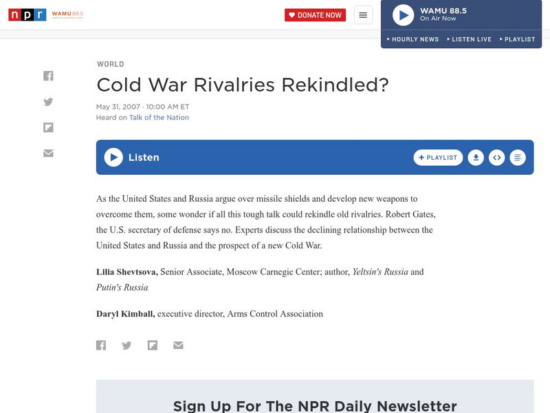 A May 2007 radio discussion (audio only) by a panel of experts on the idea of the Cold War rekindled. [30:00] Includes called in questions by listeners.