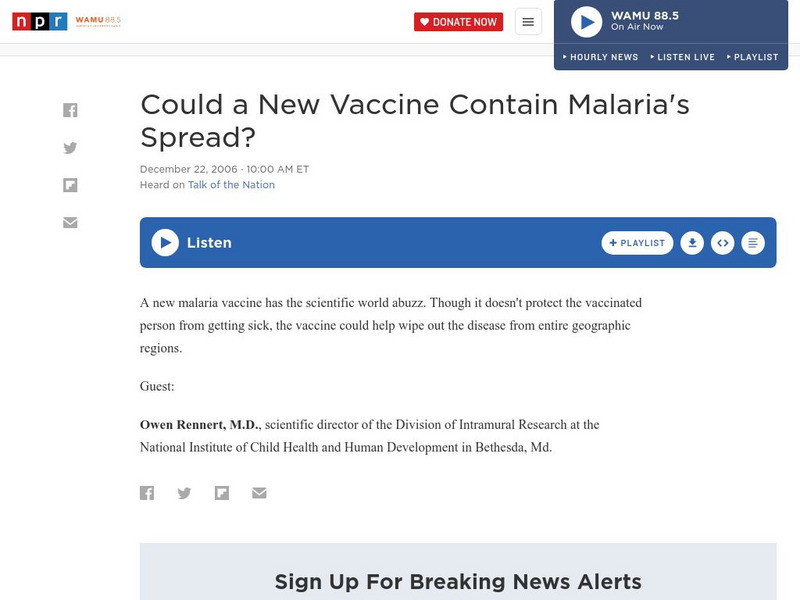 An audio interview [17:00] with Dr. Owen Rennert, a scientist from the National Institute of Child Health and Human Development, on an experimental malaria vaccine.