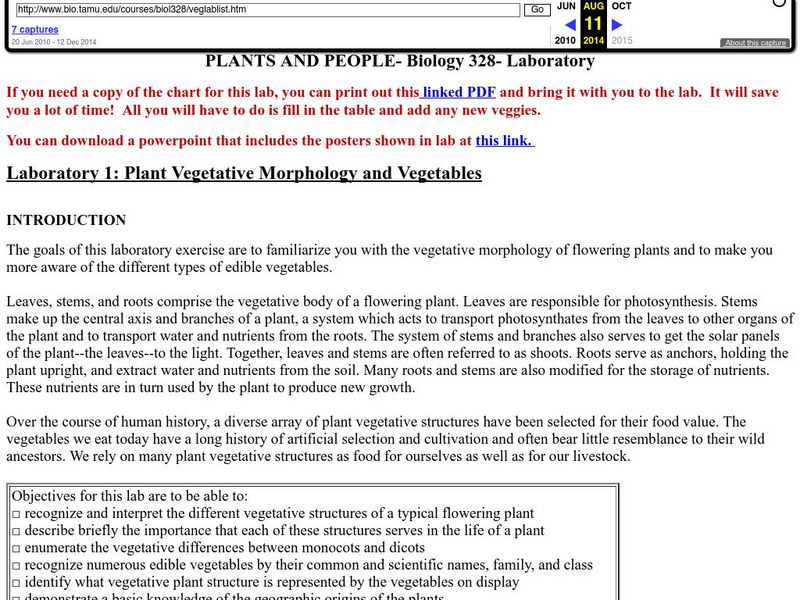 Extensive lab has students fill out large chart of plant parts, "vegetables", with pictures with information about the scientific name, structure, and origin. Several wrap-up questions are also included to make generalizations about...