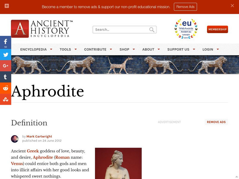 Illustrated encyclopedia entry provides a definition and overview of Aphrodite, the Greek goddess of love, beauty, and desire.