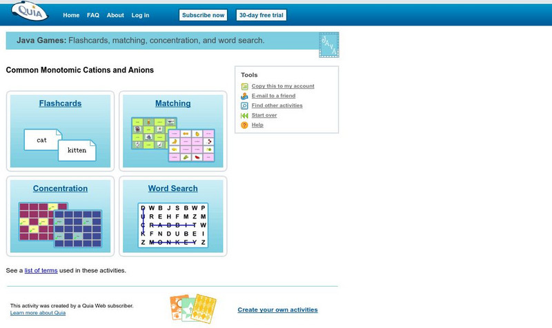This page links to a number of fun Java games, designed to help students learn the names and symbols of various ions. Games include matching, concentration and word search.