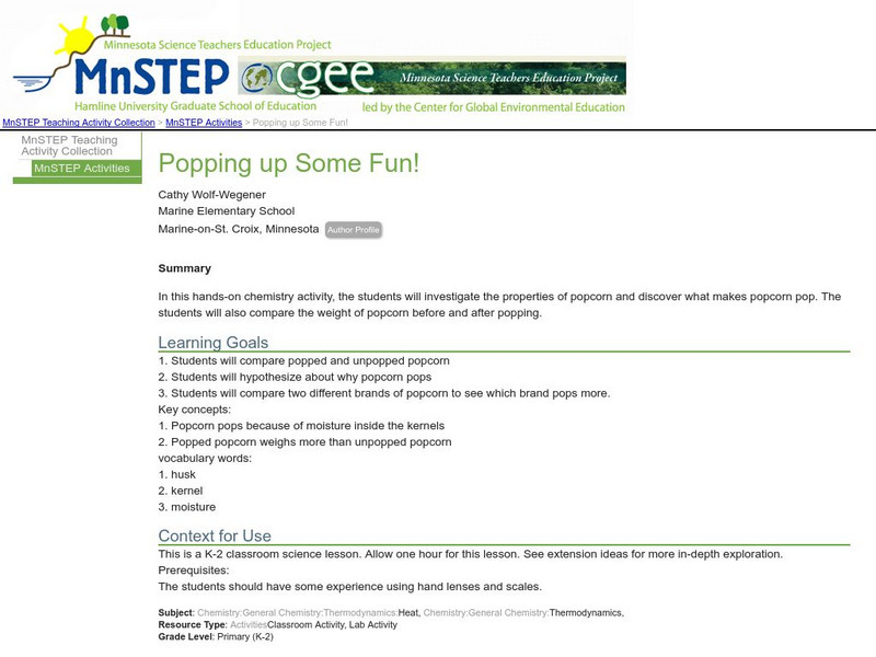 In this hands-on activity, students will investigate the properties of popcorn and discover what makes popcorn pop. They will compare popped and unpopped corn and hypothesize about why popcorn pops, discovering that popcorn pops because...