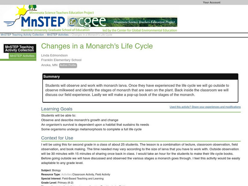 Students will observe and work with monarch larva. Once they have experienced the life cycle we will go outside to observe milkweed and identify the stages of monarch that are seen on the plant. Back inside the classroom we will discuss...