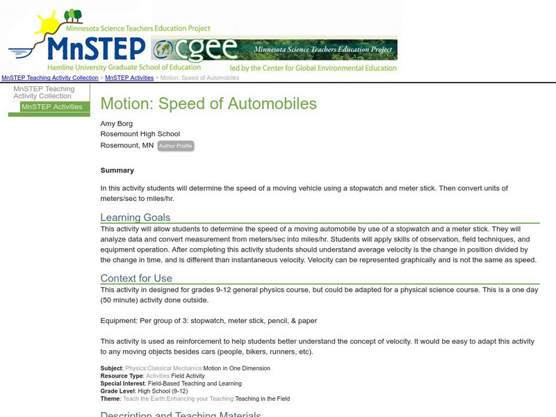 In this activity, students will determine the speed of a moving vehicle using a stopwatch and meter stick, then convert the measurement from meters/sec to miles/hr. After completing this activity, students should understand average...