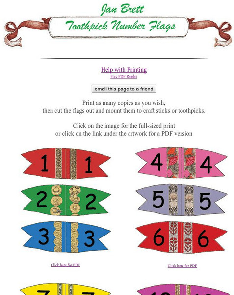 Print out these colorfully illustrated PDF file pages of the numerals 1-30. Each page shows three numerals that can be cut out and attached to a toothpick to identify the amount indicated by the numeral on the flag.