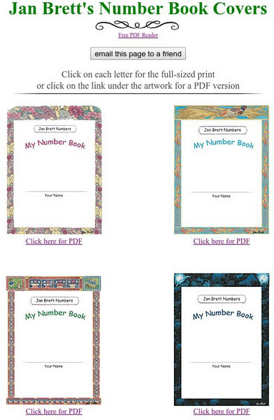 Print out these colorfully illustrated PDF file pages for your number book cover. Each number book cover has a different design around the edge with a place in the center to write your name.