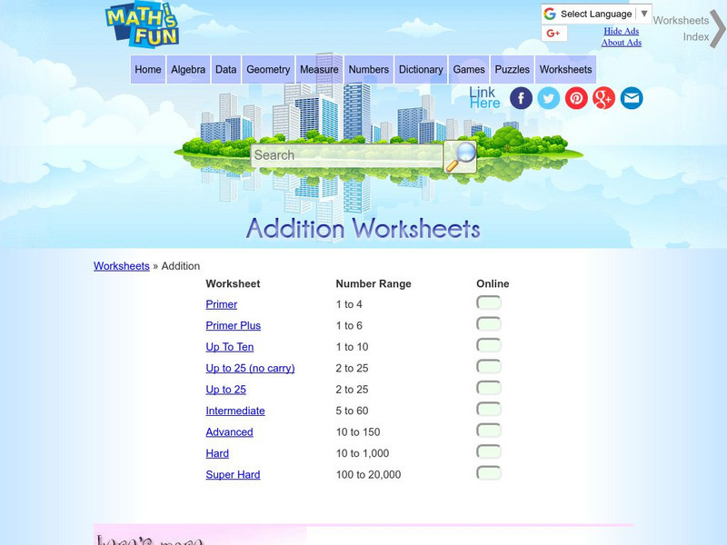 Generate addition worksheets, ranging from easy to "super hard." Teachers can access printable versions, and students can complete online versions. There are thousands of variations available.