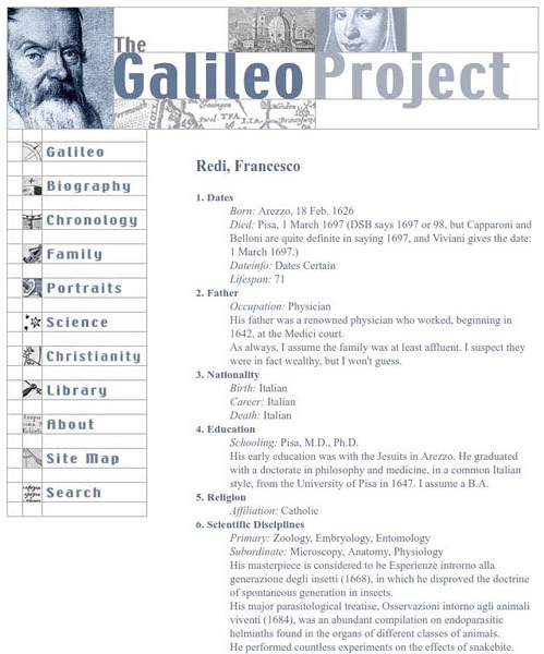 This site from The Galileo Project of Rice University provides very useful information on Francesco Redi. The information is broken up into chart format, covering topics such as: dates, father, nationality, education, religion, and so on.