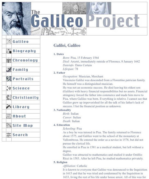 This site from The Galileo Project of Rice University contains information about Galileo's lifespan, father, nationality, education, religion, scientific disciplines, means of patronage, patronage, technological involvement, and...