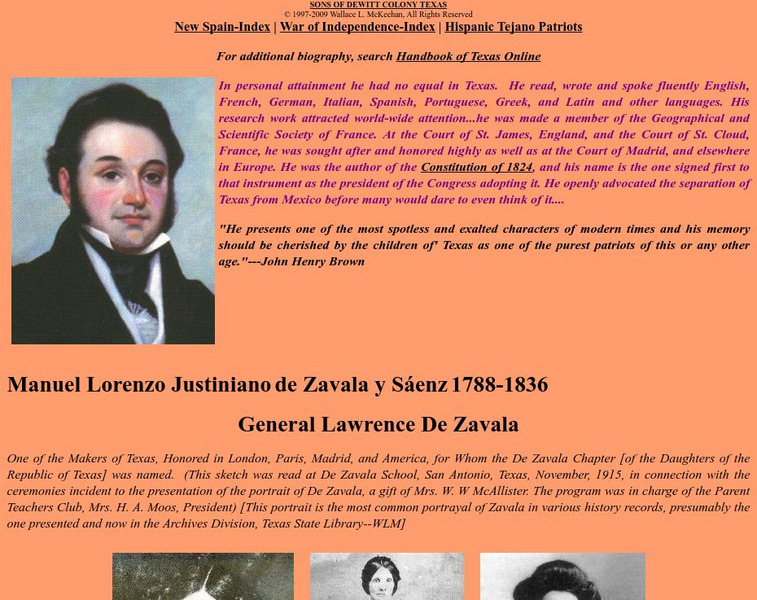 A detailed "sketch" of De Zavala. Includes a picture of his portrait and information about his role in the new Republic of Texas.