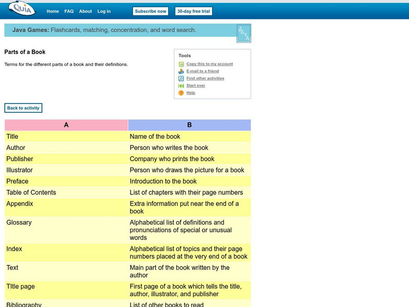This website provides chart lists and defines the parts books all readers should know, such as the title, author, table of contents, and glossary. Click on "Back to activity," to be taken to four games, which will help students learn and...