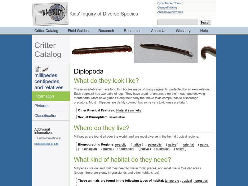 This page answers common questions that students might ask about millipedes, including classification information. It also has excellent photographs of them and links to more in-depth information.