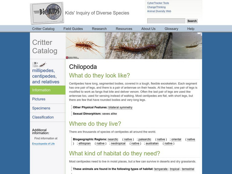 This page answers common questions that students might ask about centipedes, including classification information. It also has photographs of them, a labelled diagram of their body parts, and links to more in-depth information.