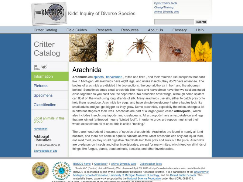 This informative site provides a general description of arachnids and then focuses on arachnids native to southeastern Michigan. Pictures and classification groupings are included.