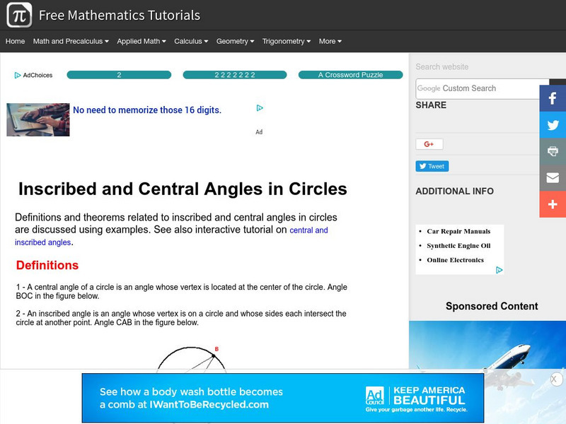 The geometry tutorial investigates the definitions and theorems related to inscribed and central angles in circles. An example with a detailed solution is included.