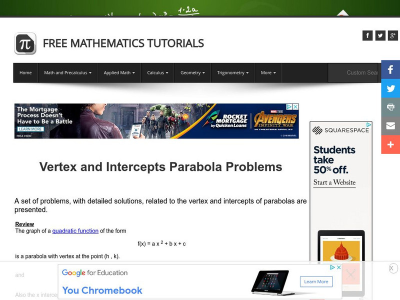 The tutorial explores the vertex and intercepts of parabolas. Some topics discussed are vertex form, vertical axis, intercepts, and graphing. The activity consists of examples with detailed solutions.