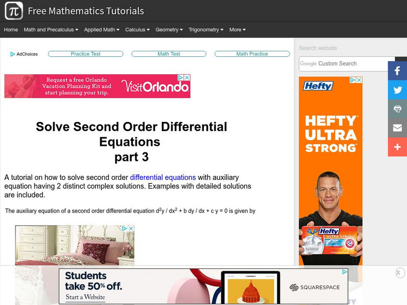 The tutorial explores second order differential equations. Topics investigated are complex solutions and how to solve second order differential equations. The resource includes examples with detailed solutions.