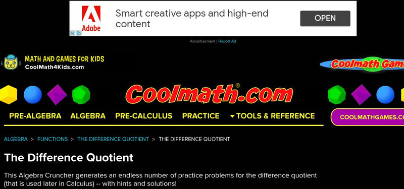 This Algebra Cruncher generates an endless number of practice problems for the difference quotient (that is used later in Calculus) -- with hints and solutions!