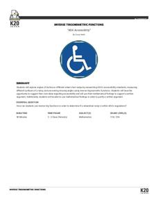 Ramp up using trigonometric ratios. After receiving a request to check school ramps to verify they meet ADA requirements, groups calculate the angle of the incline on ramps on campus. They report their findings via a letter to the...