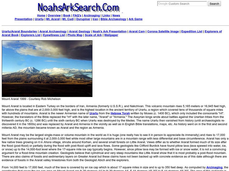 Discusses Mount Ararat and the possibility that Noah's Ark rests somewhere on the mountain. Discusses two recent explorations: the Willis and Aaron/Garbe/Corin expeditions.