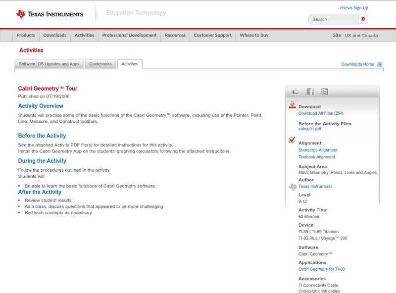 In this activity, students will practice some of the basic functions of the Cabri Geometry software, including use of the Pointer, Point, Line, Measure, and Construct toolbars.