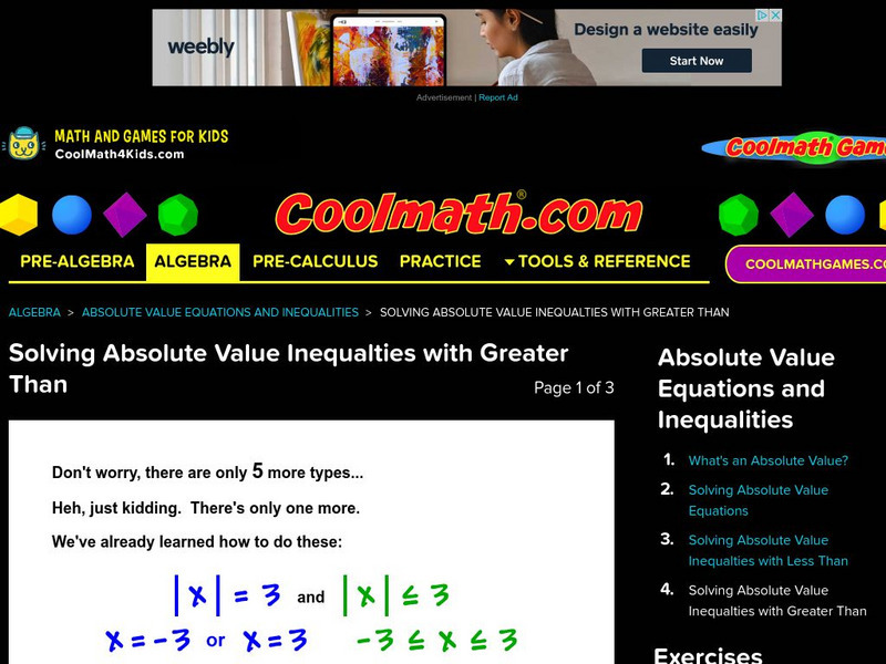 Coolmath: Solving Absolute Value Inequalties With Greater Than