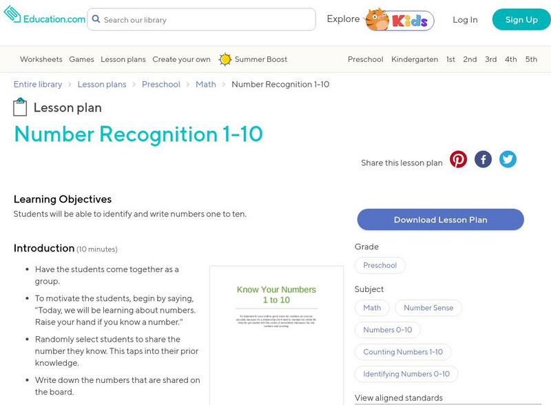 [Free Registration/Login Required] This lesson plan will help students be able to identify and write numbers one to ten using a poem by Mother Goose.