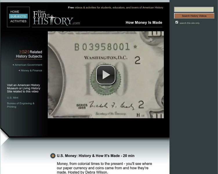 Money, from colonial times to the present - you'll see where our paper currency and coins came from and how they're made. Hosted by Debra Wilson.