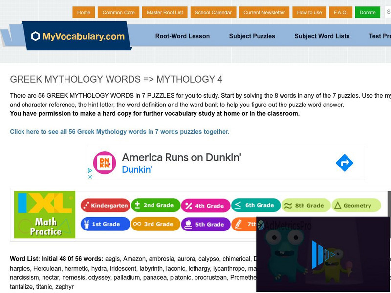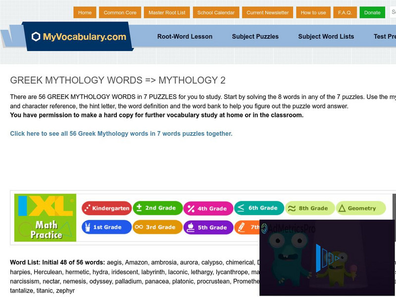 In this Mythology vocabulary word puzzle activity, www.myvocabulary.com includes a Greek Mythology word list of 48 vocabulary words in three puzzles. MATCH the Mythology vocabulary list with its vocabulary definition. Use the pull down...