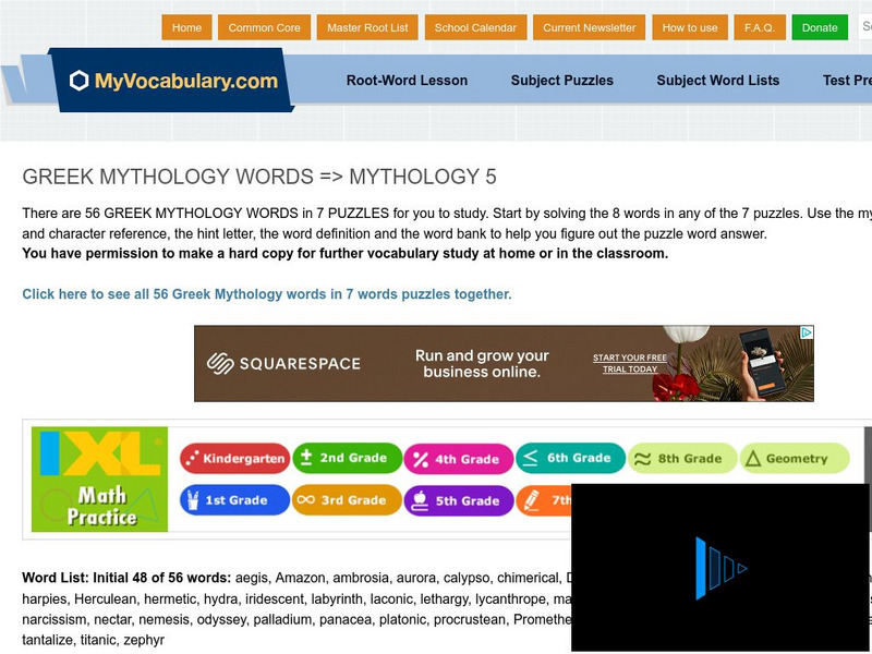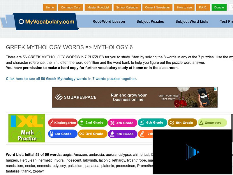 This site offers a MYTHOLOGY word list (56 words) in seven word puzzles. To solve the mythology word puzzles use the Latin root or Latin word part, the vocabulary definition, part of speech and the Greek Mythology vocabulary word list....
