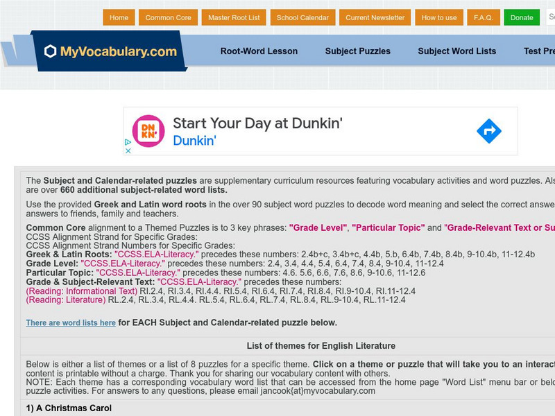 This is a list of themed puzzles for English Language Arts. Click on a theme or puzzle that will take you to an interactive activity. All content is printable without a charge. NOTE: Each theme has a corresponding vocabulary word list...