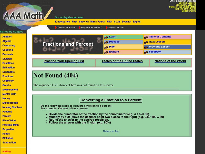 This tutorial explains how to convert fractions to percents and features practice exercises, games, and the like.