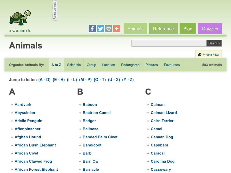 Good resource for animal facts, information, and photos on over 550 different animals organized by scientific name or group, location, or alphabetized name. One unique feature is the Phobia Filter. You can, if you wish, filter out groups...