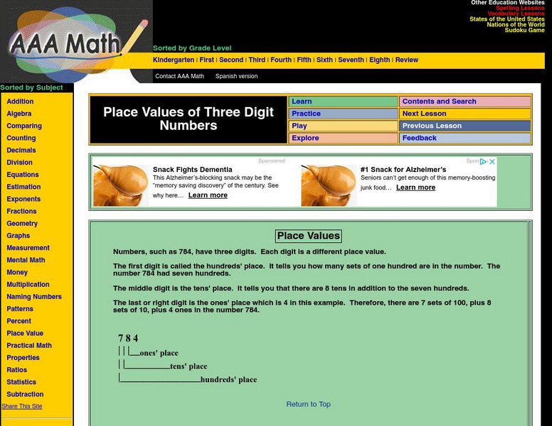 This lesson is about counting by threes from AAAmath.com. There are separate sections for learning, practice, playing a game, and exploring more about skip counting.