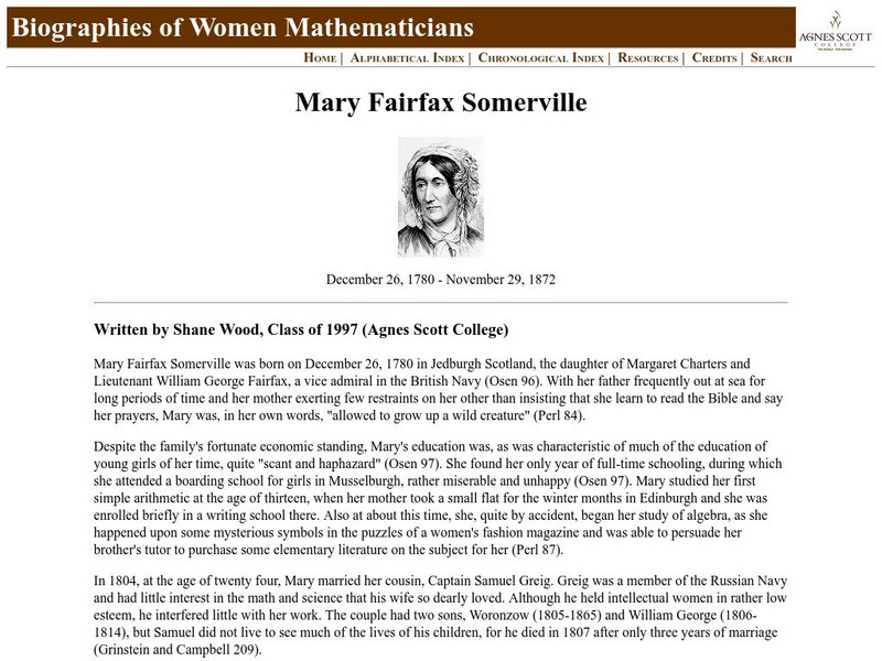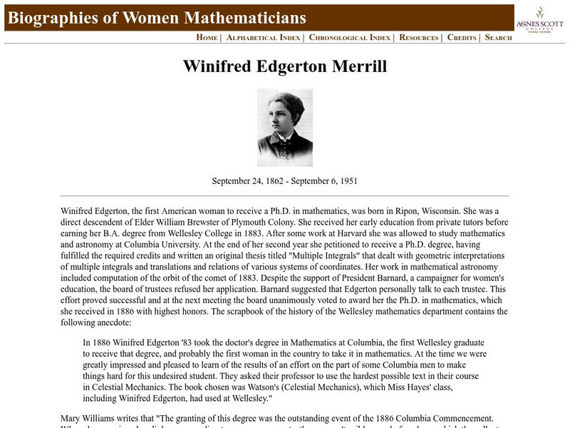 Use this site to learn about the women behind the math. Lawrence Riddle, professor of mathematics at Agnes Scott College, created this site as a tribute to women who have made accomplishments in the world of mathematics.