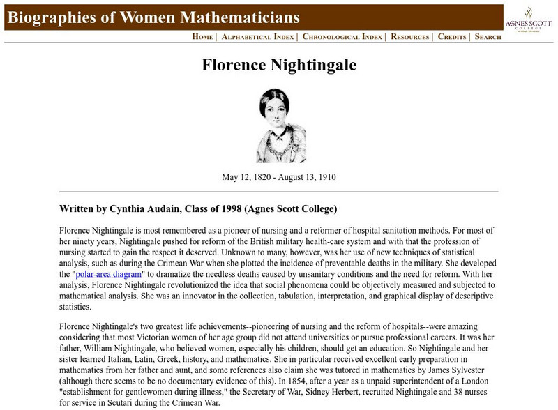 Agnes Scott College includes in its Biographies of Women Mathematicians this page on the life of Florence Nightingale. Most people do not realize that in addition to her work for nursing and hospital reform, Nightingale was also a...