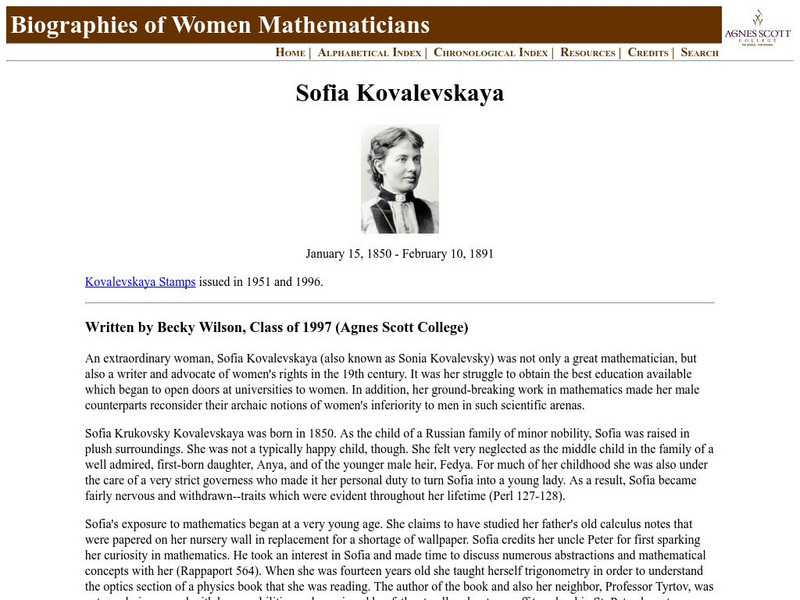 This site provides a biography of the mathematician, writer, and advocate of women's rights, Sofia Kovalevskaya (1850-1891 CE).