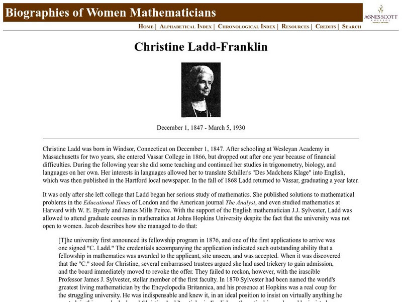 This entry from the Biographies of Women Mathematicians Web Site, Agnes Scott College, Atlanta, GA presents a summary of the life of Christine Ladd-Frankin (1847-1930 CE) with references.