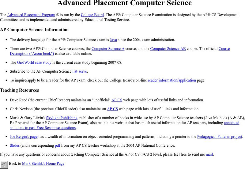 This site includes numerous links to information about the Advanced Placement Computer Science course and exam.