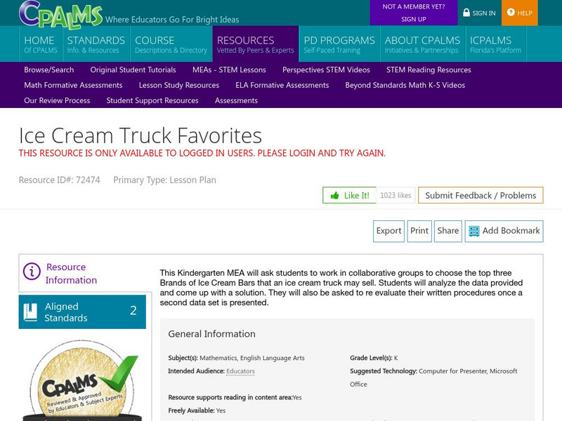 [Free Registration/Login Required] During this MEA simulation, kindergarten students will determining the top three flavors of ice cream bars that an ice cream truck should serve. Students must work in cooperative groups as they work to...