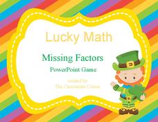 No luck required here! A St. Patrick's Day-themed missing-factor presentation prompts young mathematicians to read a multiplication problem and select the answer to complete the equation. Clicking on the correct answer allows players to...
