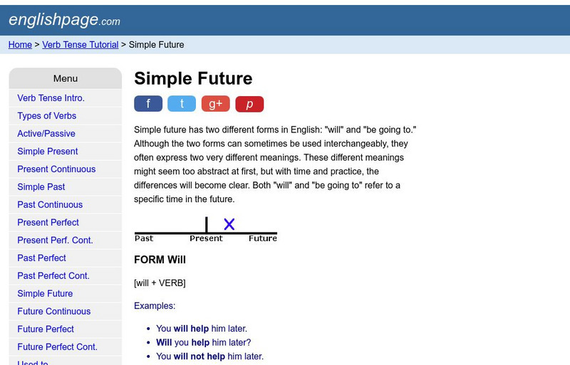 Clear explanation of how to use the simple future verb tense in English. Along with a number of examples on this page, there are links to many exercises and tests at the bottom of the page and additional verb tense information along the...