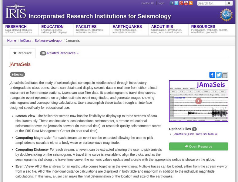 jAmaSeis facilitates the study of seismological concepts in middle school through introductory undergraduate classrooms. Users can obtain and display seismic data in real-time from either a local instrument or from remote stations.