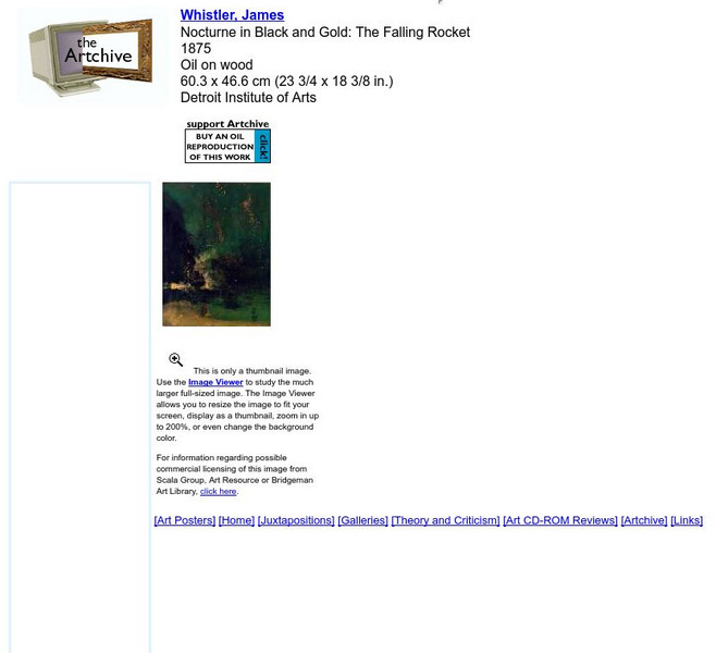 Image of Whistler's painting, "Nocturn in Black and Gold: The Falling Rocket," with general information about the painting. Provides link to large image which can be made to adjust to the size of your screen.