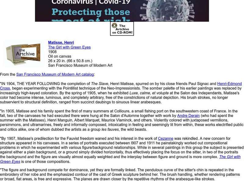 The Artchive excerpts information from a publication of the San Francisco Museum of Modern Art (SFMOMA) about Henri Matisse's painting "The Girl with the Green Eyes."