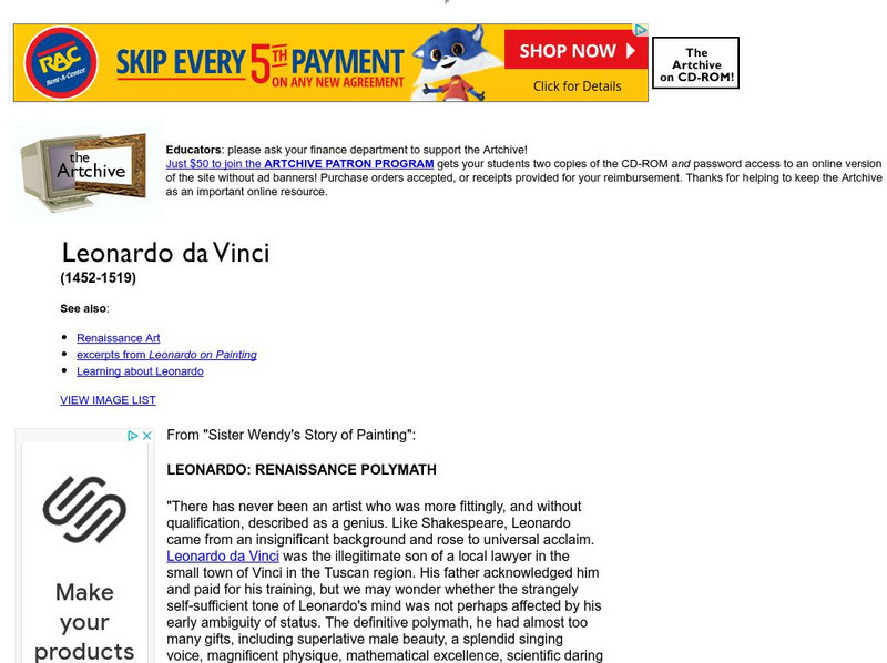 Biographical note on Leonardo da Vinci excerpted from "The Story of Painting," by Sister Wendy Beckett, art historian and host of programs about art history and appreciation airing on PBS. Includes internal links to reproductions of some...