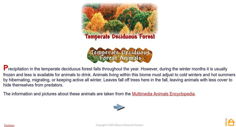 At this site from the Evergreen Project of the Missouri Botanical Garden, you will read about temperate deciduous forest animals. Then you can see graphics and read descriptions of some of these animals.