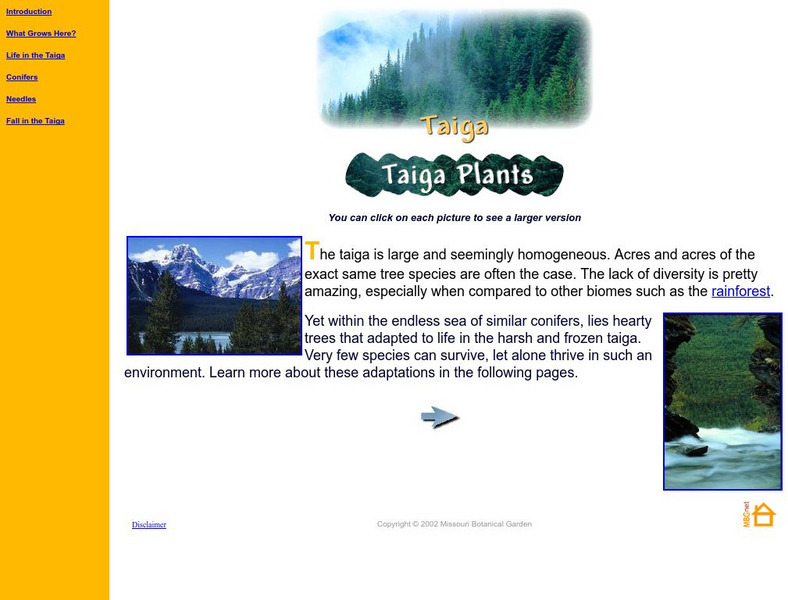 At this site from the Missouri Botanical Garden, you can learn about conifers, needles and the taiga in the fall. Click on the pictures to view a larger version.